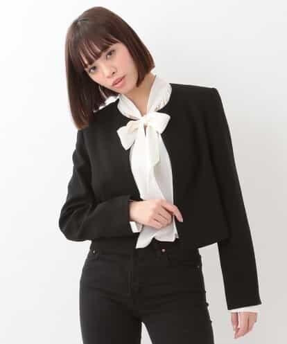 ノーカラーにワンフックで仕立てたすっきりと上品なショートジャケット。ウールをブレンドした高級感のある風合いがフォーマルなシーンにもぴったりな一着です。パネルラインを活かしたさりげないポケットなど、ディテールを抑え、素材の美しさが際立つデザインに。ショート丈なので、ワンピースから様々なボトムと好相性のジャケットです。model:H164 B82 W59 H88 着用サイズ:M