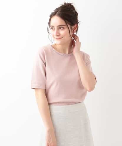 ビジュー付き5分袖ニットプルオーバー ライトピンク 40