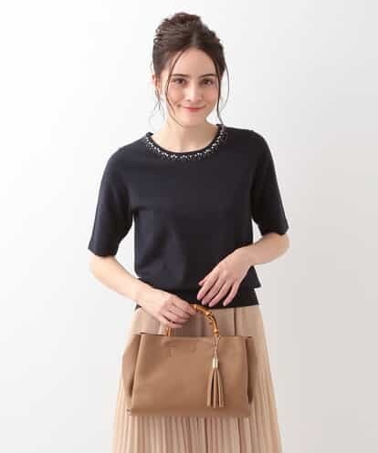 ネックラインに施したビジューが顔周りを華やかに演出してくれる半袖ニットプルオーバー。伸縮性に優れた程よいサイズ感にソフトな風合いが着心地の良い一枚です。甘くなり過ぎず、フェミニンなスタイルやきちんと感のあるパンツスタイルと合わせるのもお勧めです。同じテキスタイルで仕立てたビジューボタンカーディガン【EUCDD01049】とのアンサンブルもお勧めです。model:H165 B79 W60 H88 着用サイズ:M