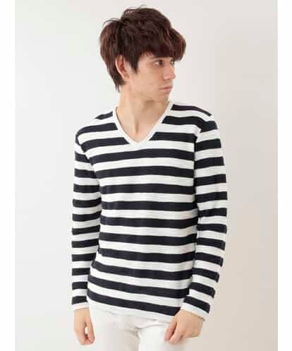 ボーダー柄Vネックニットトップ ネイビー 48