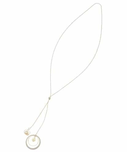 対称のフェイクパールがアクセントになったラリエット。ラメの入ったサークルモチーフが胸元を華やかに演出します。ネックレスの長さは自分好みに調節が可能。長めにして他のネックレスと合わせた2連使いもお勧めです。