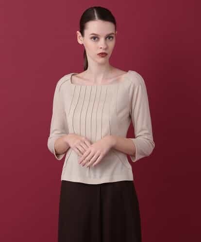 ネックからデコルテにかけて入るピンタックデザインが光るこだわりのあるカットソー。ジャケットやカーディガンなどの羽織りモノを合わせ、ピンタックデザインをのぞかせた着こなしがおすすめです。デコルテラインがキレイに見えるスクエアカットが女性らしい装いに。同ラインでピンタックスタンドカラーカットソー【GBKAE13190】の作りもございます。model:H170 B80 W58 H81 着用サイズ:M
