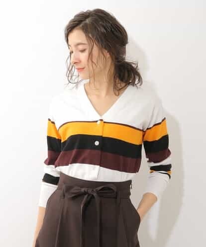 ■1枚でサマになるマルチボーダーカーディガン■ 程良い肉感がちょうどいいボーダーニットカーディガン。オリジナルのランダムな配色のマルチボーダーがカジュアルになりすぎず女性らしさを引き立たせてくれます。浅めのVネックデザインは羽織りとしてはもちろん、ボタンを留めてプルオーバーとしての着こなしもおすすめ。細すぎずゆるすぎない絶妙なサイズ感は1枚でサマになるのも嬉しい。※袖のボーダー柄が身頃と同配色に仕様変更しております。実際の仕様は詳細画像をご確認ください。