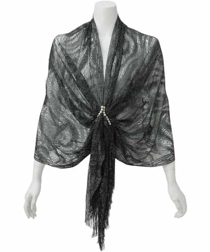 美しいラメメッシュがコーディネートに華やぎを添えるストール。フェイクパールをあしらったフロントがクラス感を演出します。シンプルなドレススタイルが格段にランクアップ!ボリューミーなフリンジにも注目です。