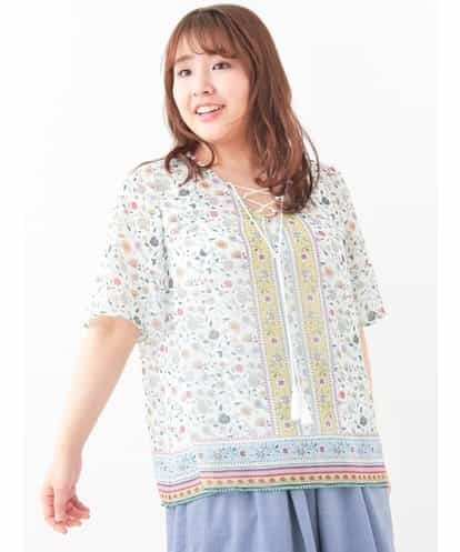 軽やかで透け感のあるシフォン素材のブラウス。胸元のレースアップがカジュアルな雰囲気をプラスし、アクセントになっています。タンクトップやキャミソールをインナーに合わせるのがおすすめです。長めの袖がさりげなく二の腕をカバーしてくれます。