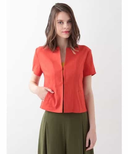 さらっとしたリネン混の肌触りが着心地抜群のショートジャケット。緩やかに開いたV字のフロントに、デザインダーツがアクセントになっています。model:H170 B80 W58 H81 着用サイズ:M