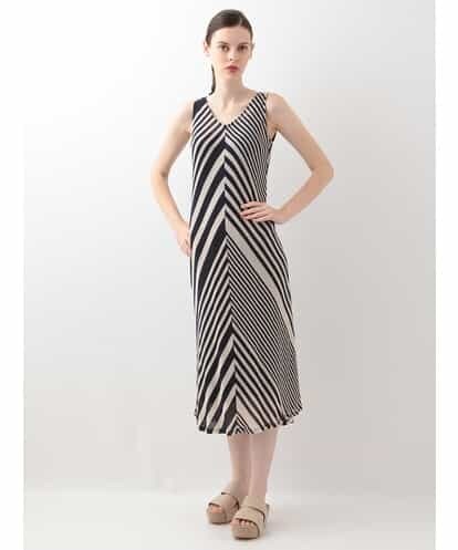 季節感のある薄手のコットンニットに、バイアスのマルチストライプがエレガントなスリーブレスドレス。左右のストライプのピッチの変化や、柔らかなニットのドレープのコンビネーションが上品なデザインに仕上がっています。※インナードレス付き
