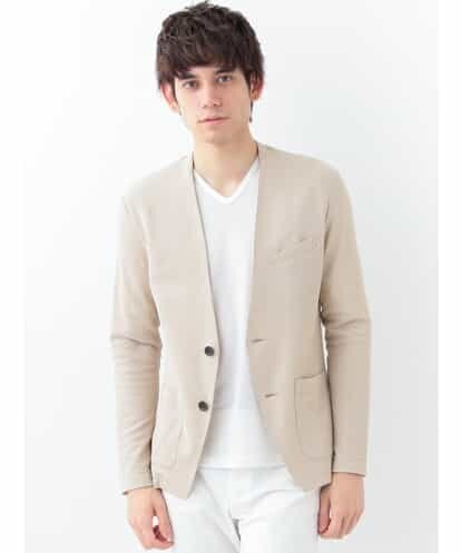 軽やかな鹿の子ポロ素材のジャケットです。襟のないデザインで、袖にはカットが入っているので、ロールアップしやすくなっています。肩線、脇線、裾付けまわりに消臭効果のあるミシン糸を使用しているのも嬉しいポイントです。model:H182 C92 W71 H90 着用サイズ:48