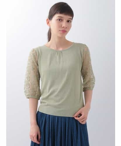 【トレンドのレースアイテム】Amapola LACE 刺繍スリーブニットプルオーバー ライトグリーン 40