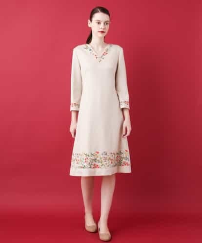 襟元・袖・裾にほどこしたボタニカルモチーフの刺繍が華やかさをプラスするドレス。柔らかなウールの風合いのベースの生地に、刺繍も春らしいカラーで、シンプルなシルエットを引きたてるデザインになっています。春先に向けて長く着ていただけるアイテムとなります。※バックファスナー、裏地付きmodel:H170 B80 W58 H81 着用サイズ:M※全国のシビラショップではベージュの他に ブラック の取扱いもございます。