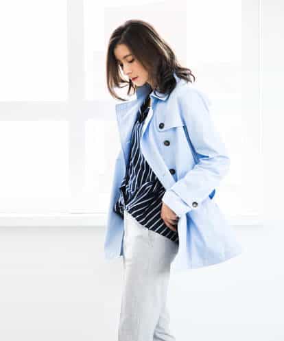 ■撥水加工が嬉しい定番トレンチコート■ ベーシックでシンプルな形がトレンド関係なく長く御愛用いただけるトレンチコート。ボトムを選ばないハーフ丈は季節の変わり目に活躍してくれます。着心地の良い柔らかな素材に、今季は袖や肩周りのサイズ感を見直すことで、窮屈感も少なく着用していただけるよう仕上げました。無駄な切替え線をなくし、立体的というよりフラットめにつくることで体のラインをより美しく見せるよう仕上げたシルエットはすっきりと女性らしい印象に。きちんと感のある1枚は毎日の通勤にもおすすめです。撥水(水をはじきやすい)加工素材を使用。※屋外での撮影は色味が多少異なる場合がございます。商品の色味は、スタジオ撮影の画像をご参照ください。 ※サンプルでの撮影となるため、実際にお届けする商品と仕様やサイズが異なる場合がございます。